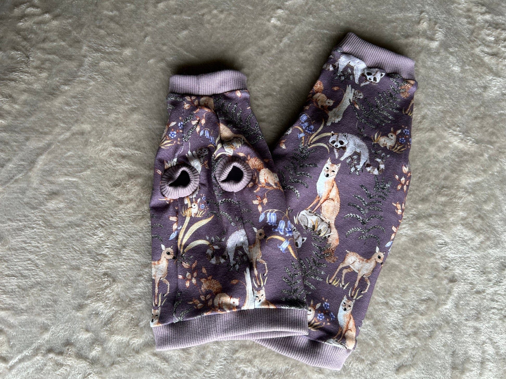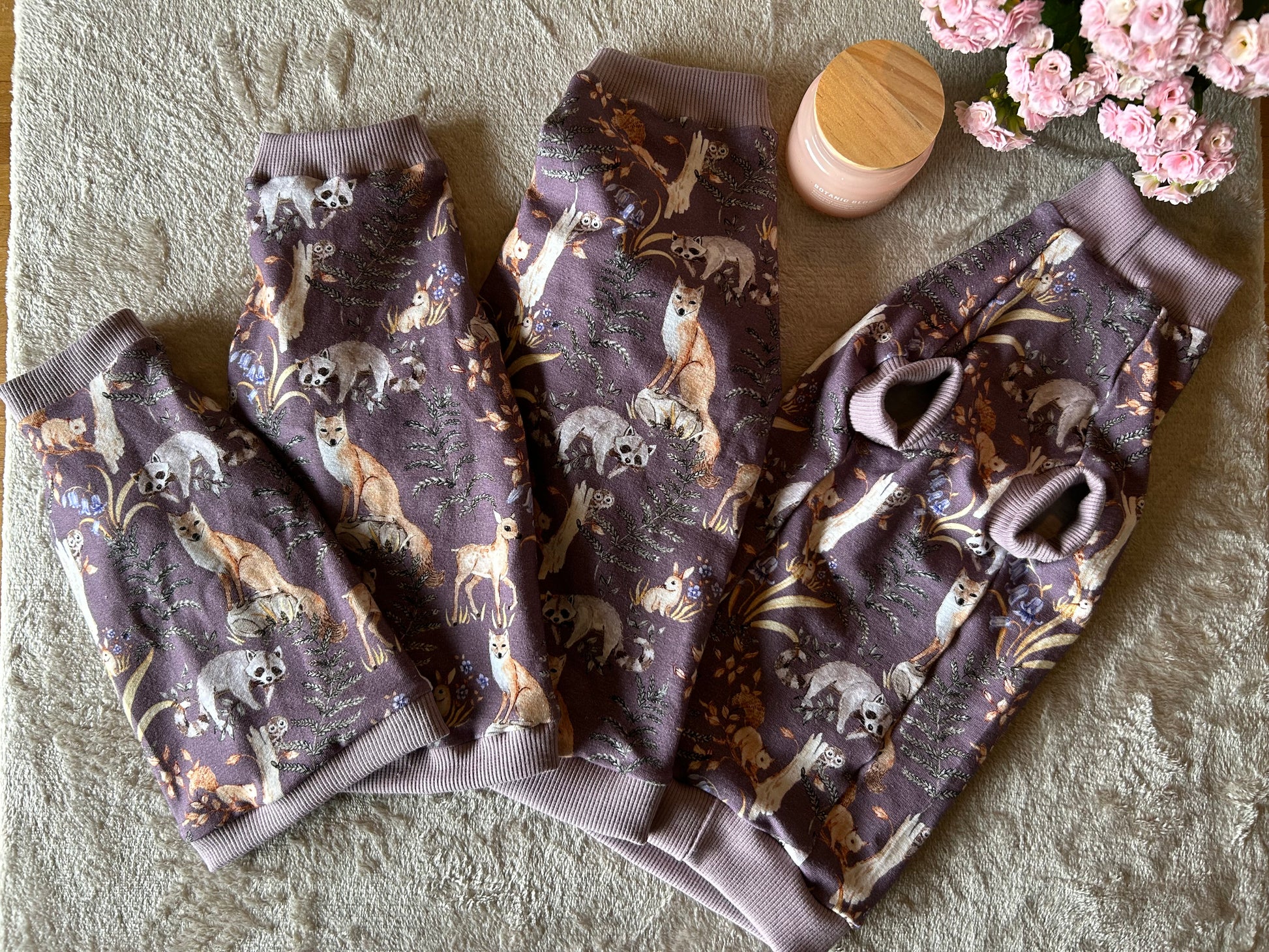 Motivet är en sann glädjespridare! På den lila basen hittar du lekfulla illustrationer av skogens invånare – rävar, ugglor och rådjur – som ger din katt en gullig och unik look.