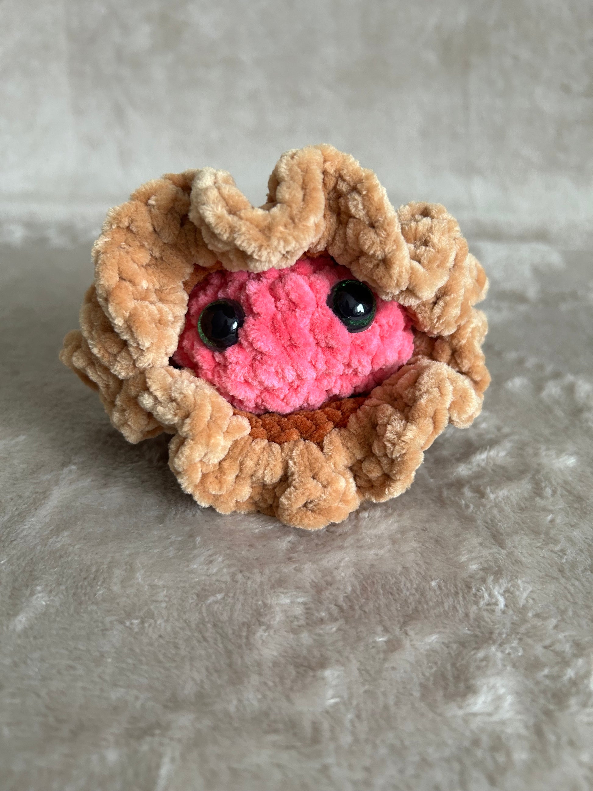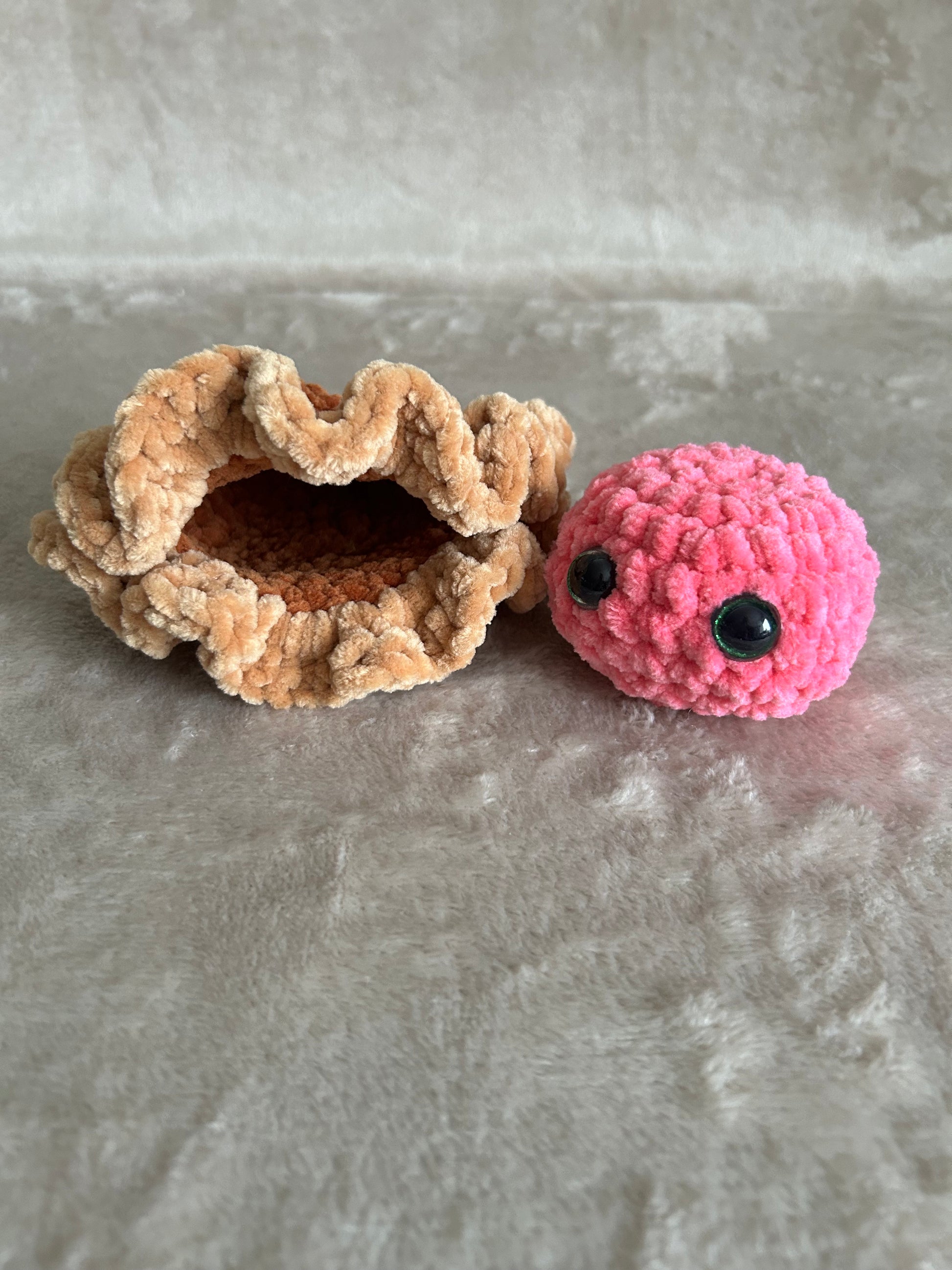 Detta virkade ostron är ett charmigt och lekfullt hantverk som för tankarna till havet och strandfynd. Med sitt mjuka uttryck och fina detaljer blir det en unik inredningsdetalj som väcker leenden – perfekt för dig som älskar havstema och handgjorda ting.