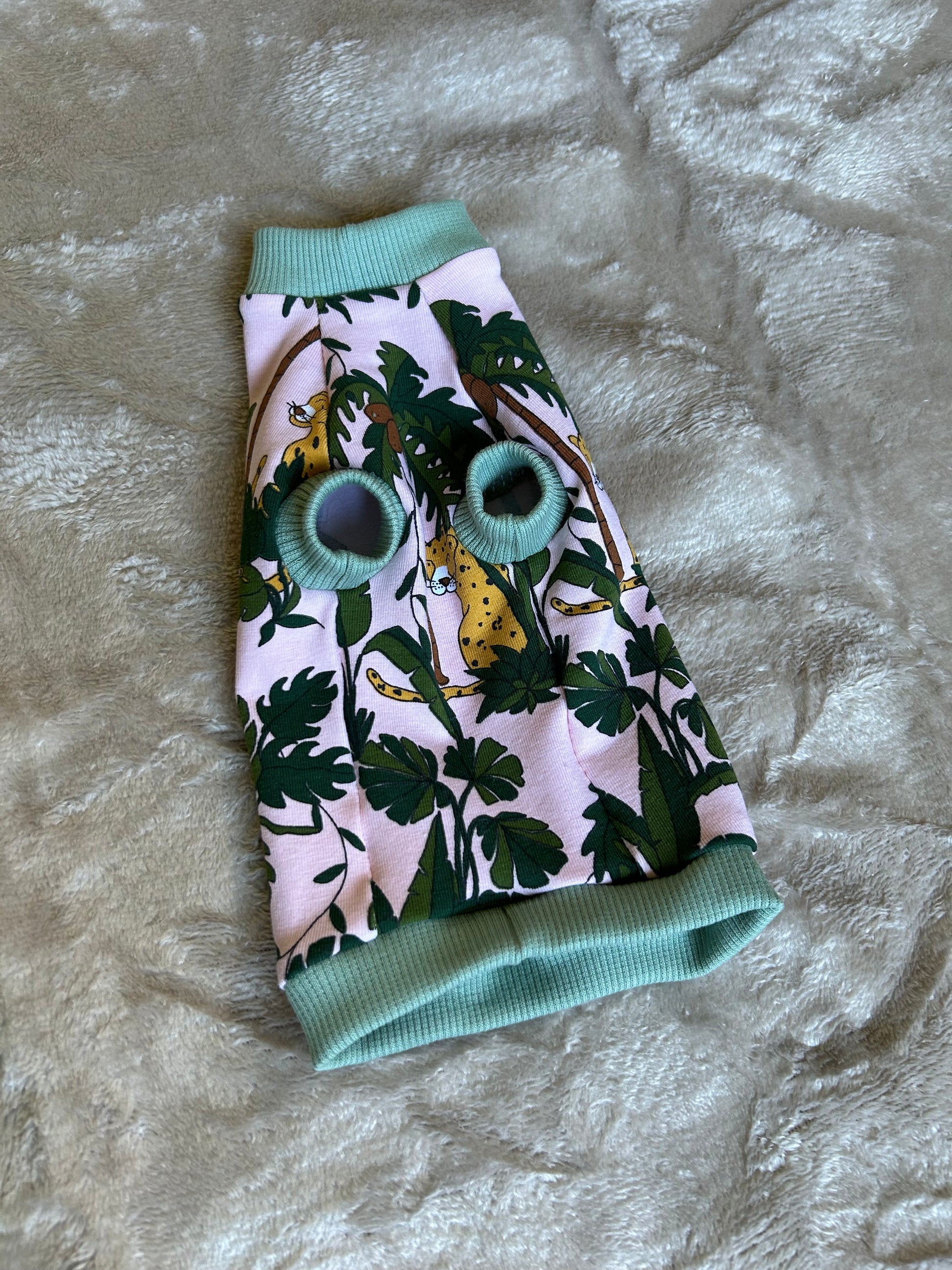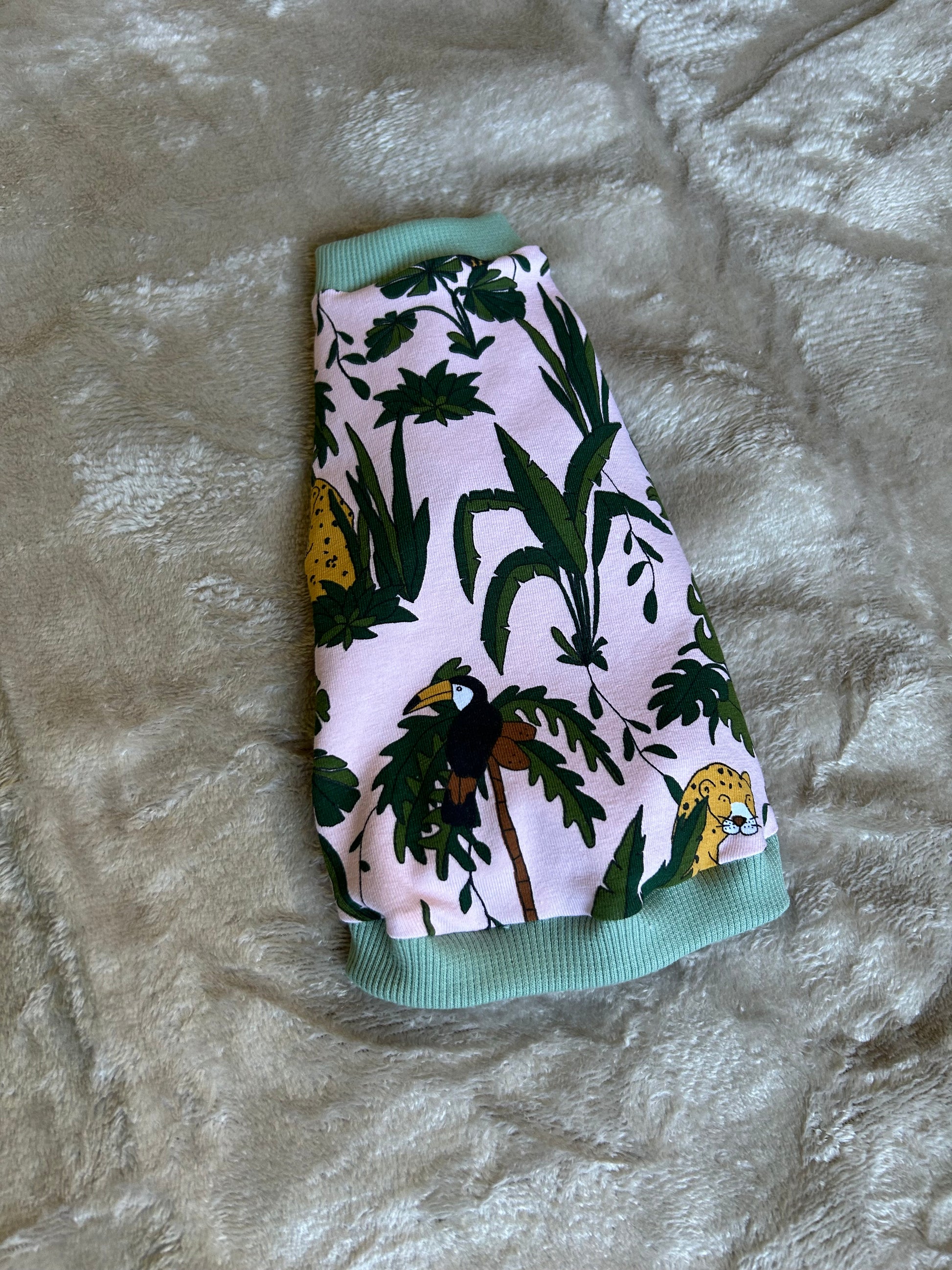 Låt din unika sphynx utforska djungelns spännande värld – i stil och komfort! Vår handgjorda t-shirt med ett färgstarkt och lekfullt jungelmönster är det perfekta plagget för din äventyrliga kisse.